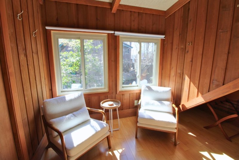 - Main level bathroom has detached sinks and is shared with the bedrooms.